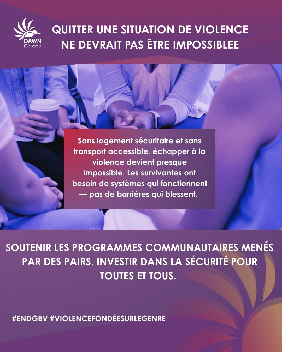 Alors que nous soulignons les 16 jours d’activisme contre la violence fondée sur le genre et les 12 jours d’action contre la violence faite aux femmes, reconnus au Québec, nous vous invitons à partager ces messages et à nous aider à sensibiliser et à soutenir la cause visant à mettre fin à la violence envers les femmes, les filles et les personnes de genre divers.